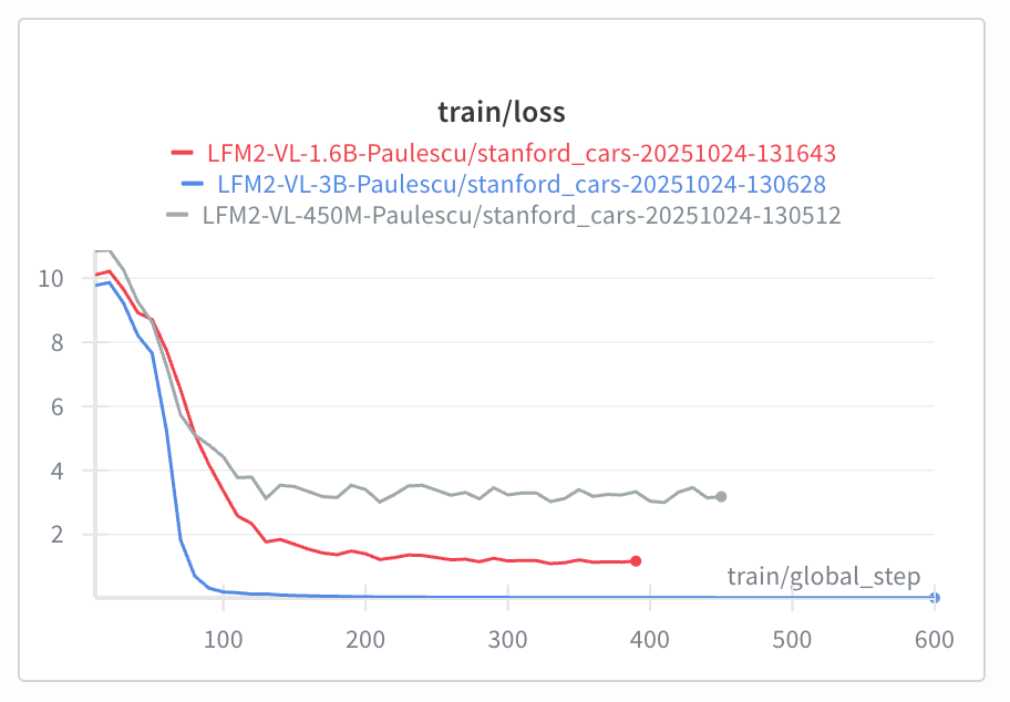 $ make fine-tune CONFIG_FILE=finetune_cars_v2.yamlLooking at the training loss curve we see the 3 curves saturate at very different levels, sorted by size from LFM2-VL-450M to LFM2-VL-3B, with LFM2-VL-3B reaching the lowest loss.