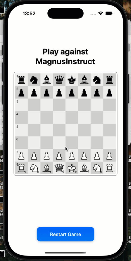 At the end of this tutorial you should be able to create an iOS app like this with an embedded LLM chess player.